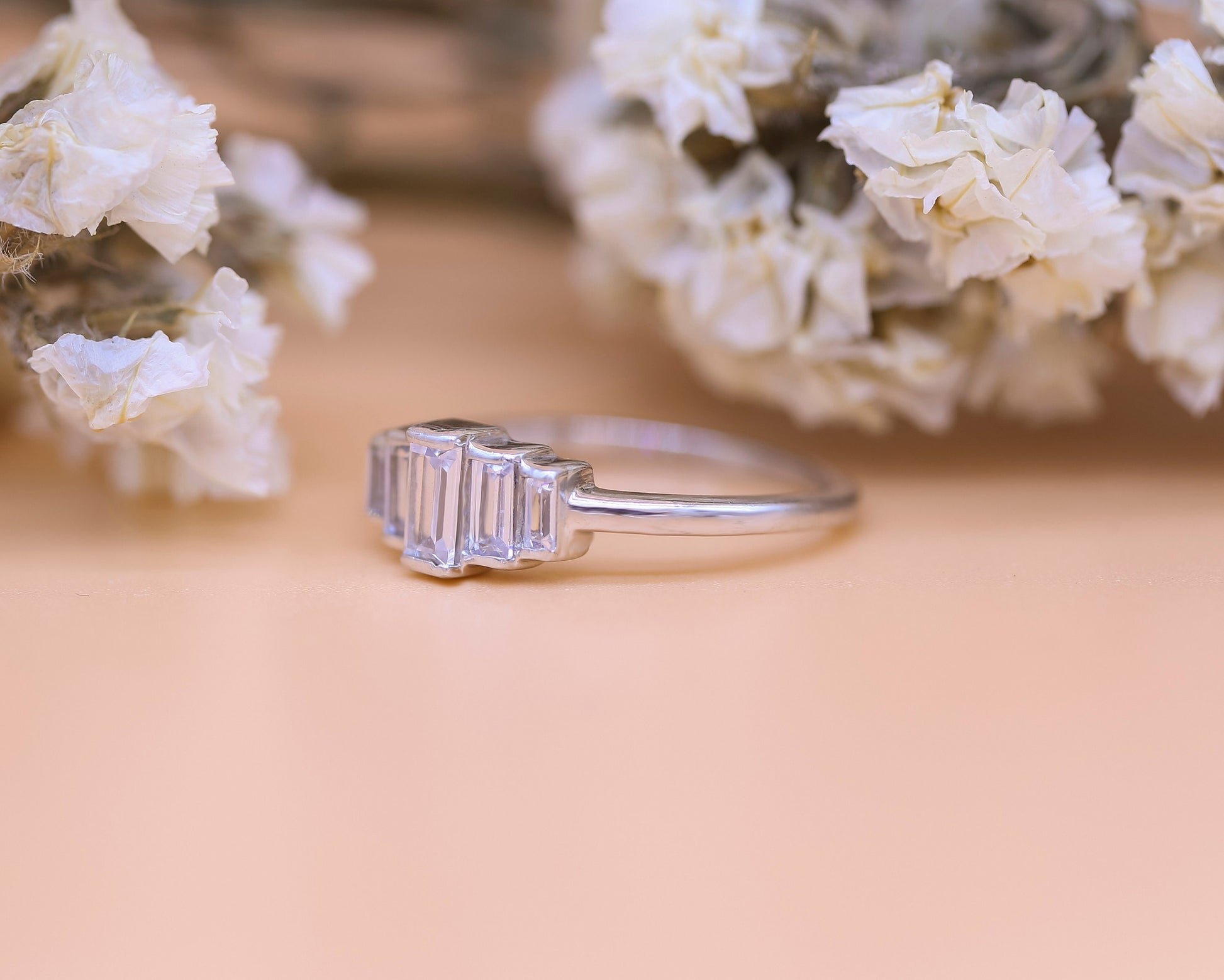 5 Graduating half bezel set Baguette Moissanite anniversary ring, 5 stone engagement ring, ring for her, gift for women.