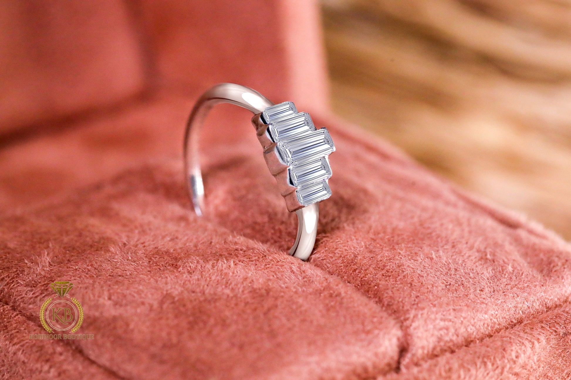 Got questions or concerns? Just send us a message — we're here to help!5 Graduating half bezel set Baguette Moissanite anniversary ring, 5 stone engagement ring, ring for her, gift for women.