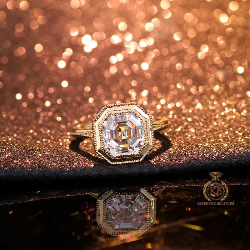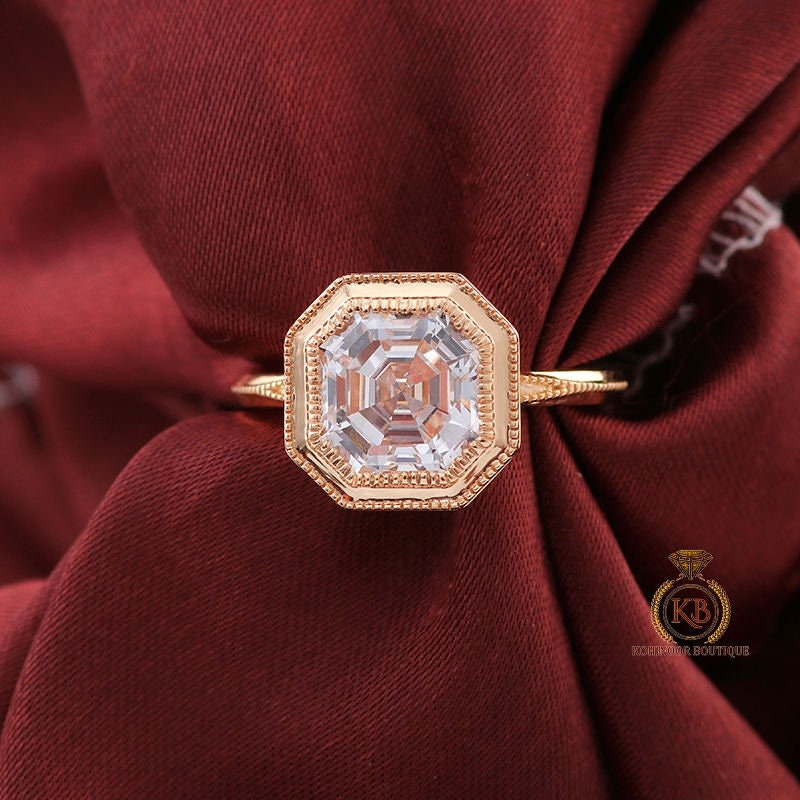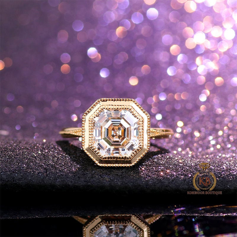 Got questions or concerns? Just send us a message — we're here to help!Asscher cut Milgrain Bezel Moissanite Solitaire with knife edge band Engagement Ring , wedding anniversary gift, birthday gift, ring for her