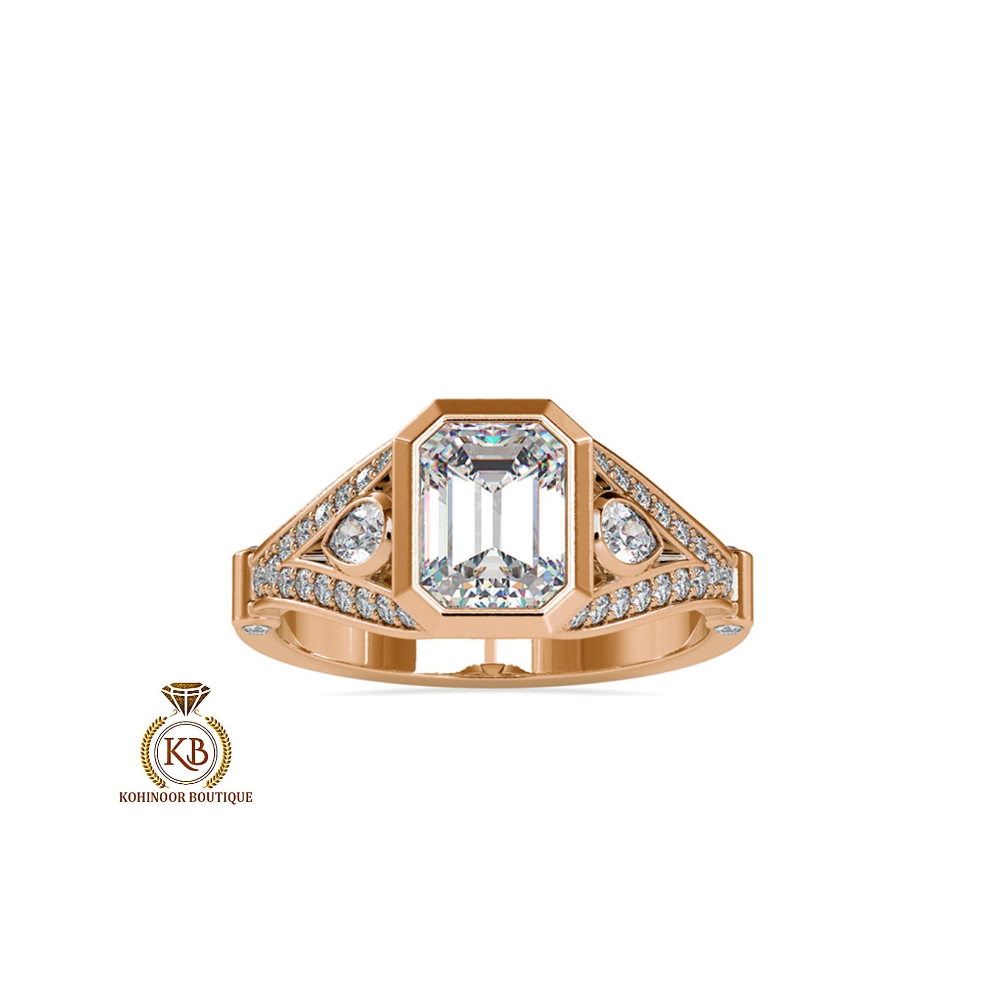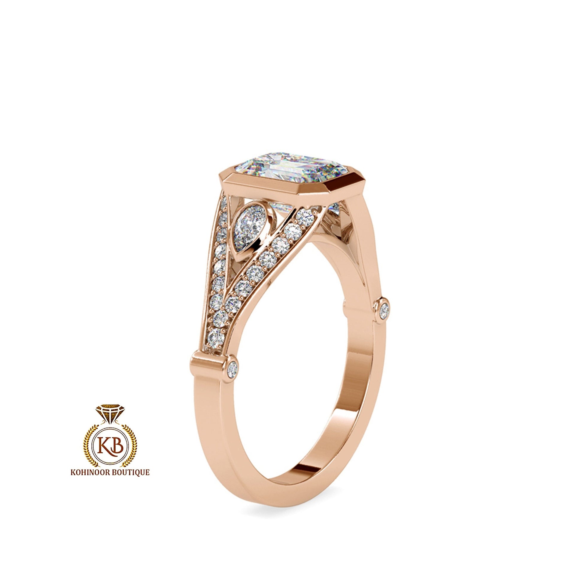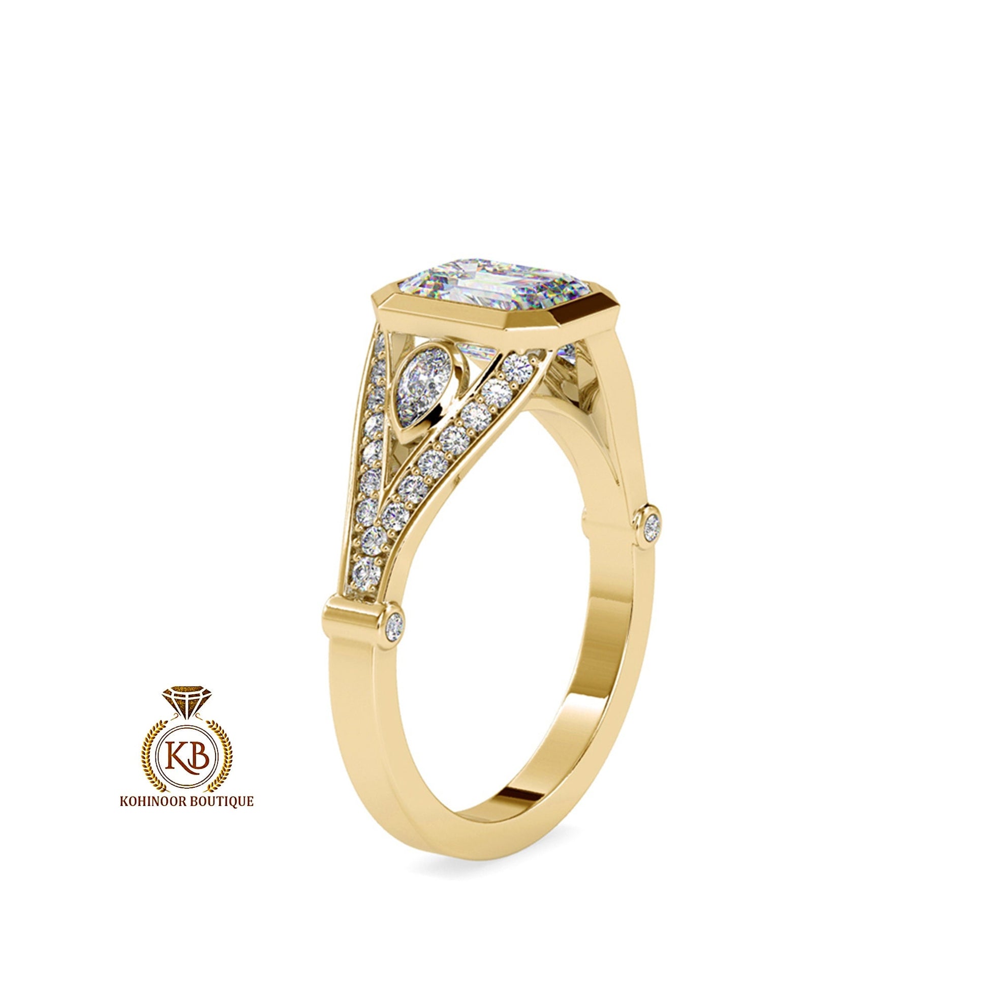 Got questions or concerns? Just send us a message — we're here to help!Bezel set Emerald and Pear Cut 3 stone with side pave split shank Moissanite Engagement ring, Ring for women, art deco ring, ring for her.