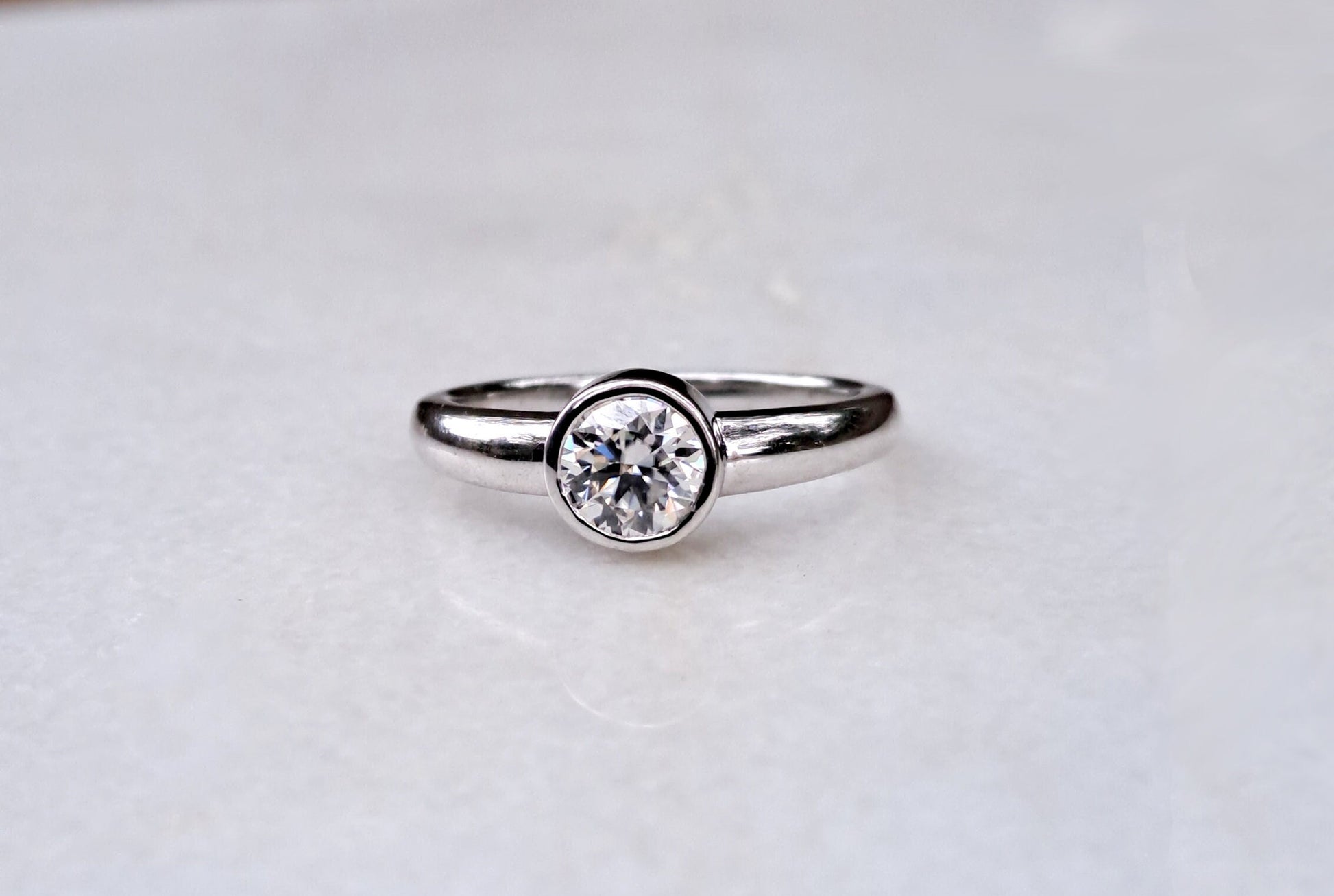 Got questions or concerns? Just send us a message — we're here to help!Bezel set Round Moissanite Engagement\ring, Promise ring, Proposal ring, dainty engagement ring, wedding anniversary ring, gift for her