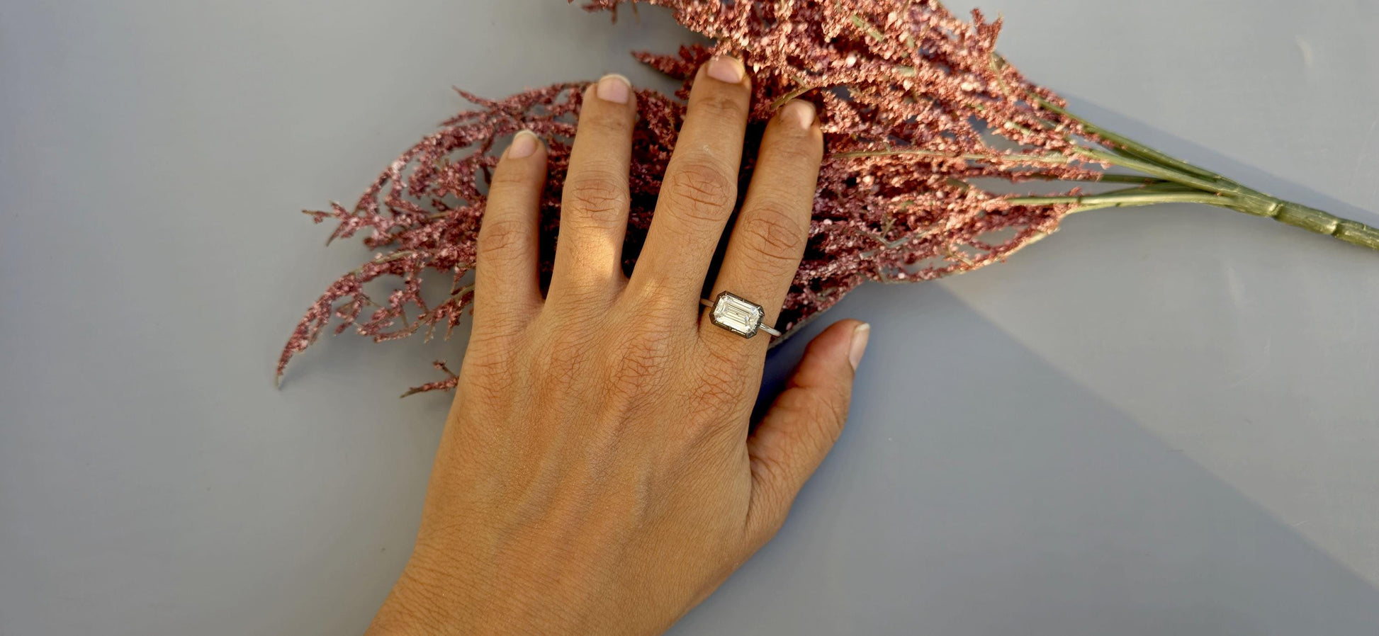 East West set Elongated Emerald Cut Moissanite Georgian cut down button back solitaire engagement ring, ring for her, ring for women