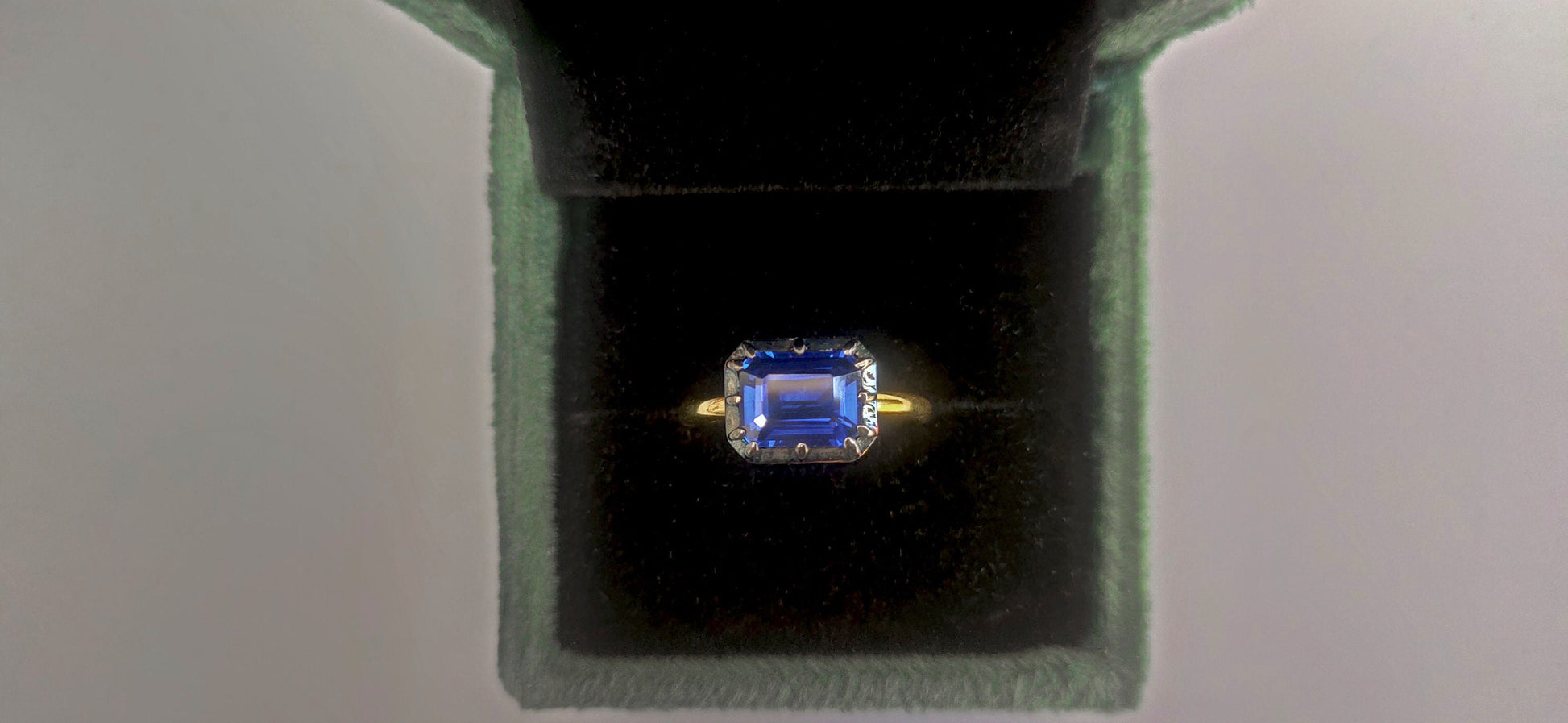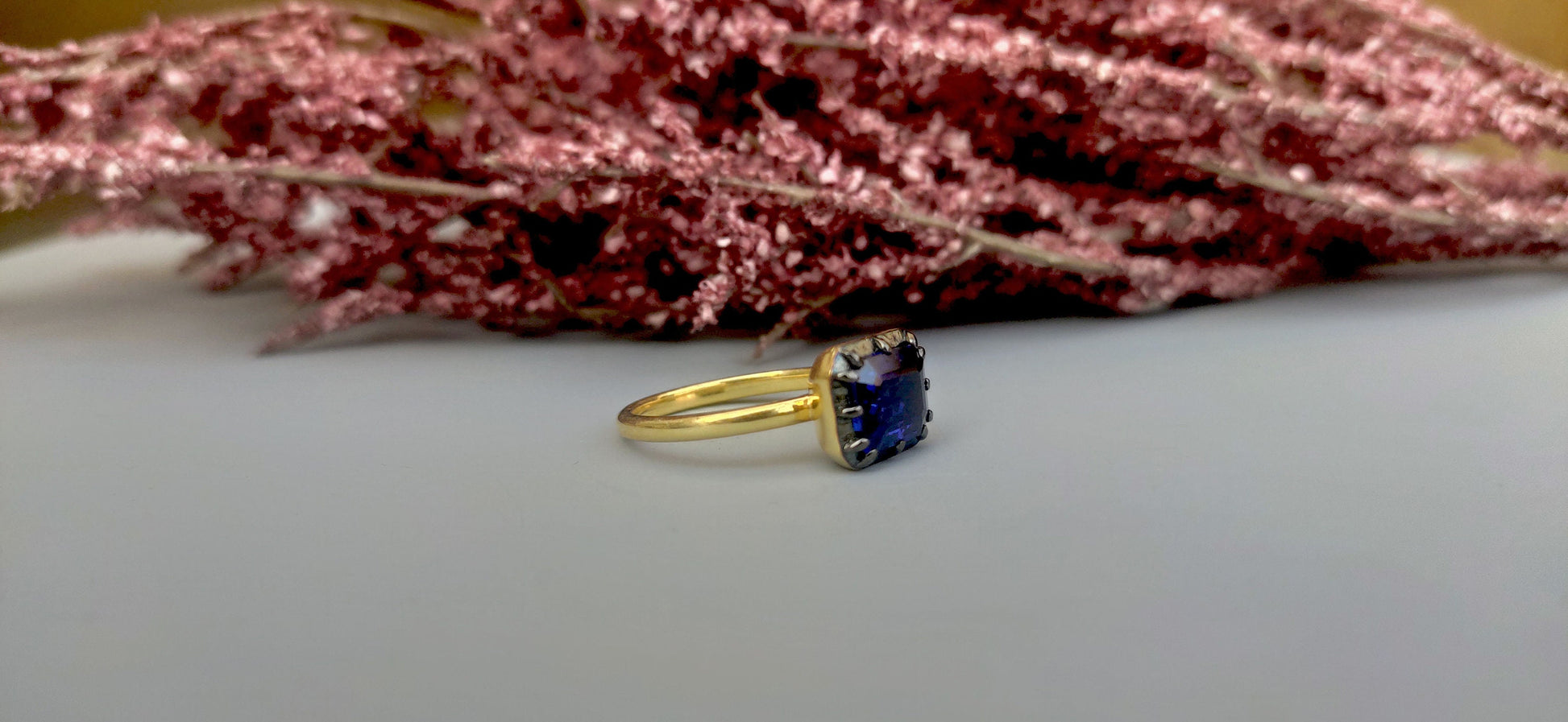 East West set Lab Blue sapphire emerald Cut Georgian cut down button back solitaire engagement ring, ring for her,ring for women