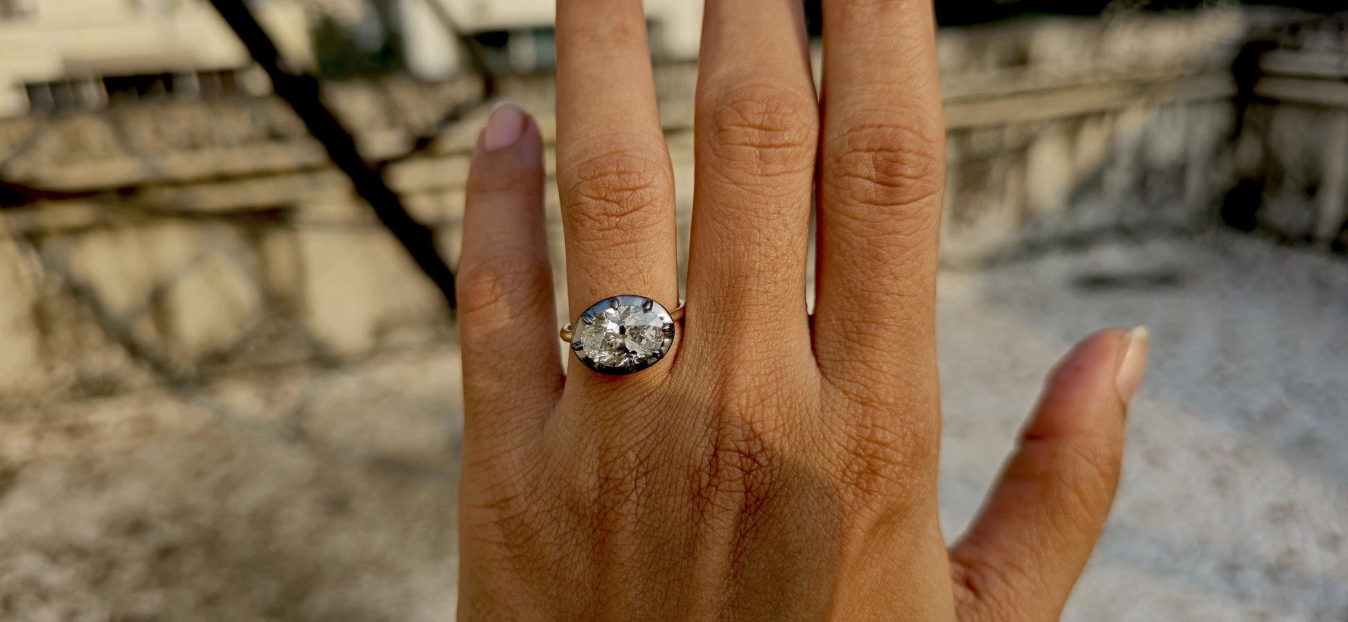 East west set Old mine cut Oval Lab grown Button Back Georgian Cut Down Set ring, blackened gold ring ring for women, Ring for her.