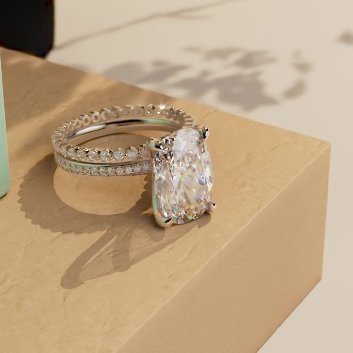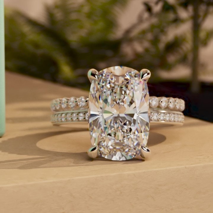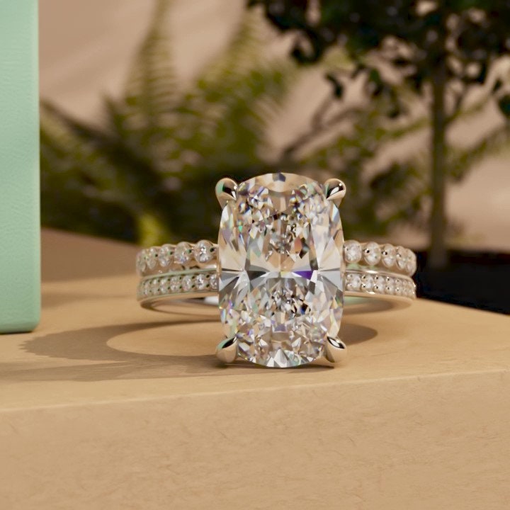 Got questions or concerns? Just send us a message — we're here to help!Elongated Cushion Cut Pave Basket Moissanite Engagement Ring, Wedding Bridal Set, Anniversary gift for wife, Ring for women