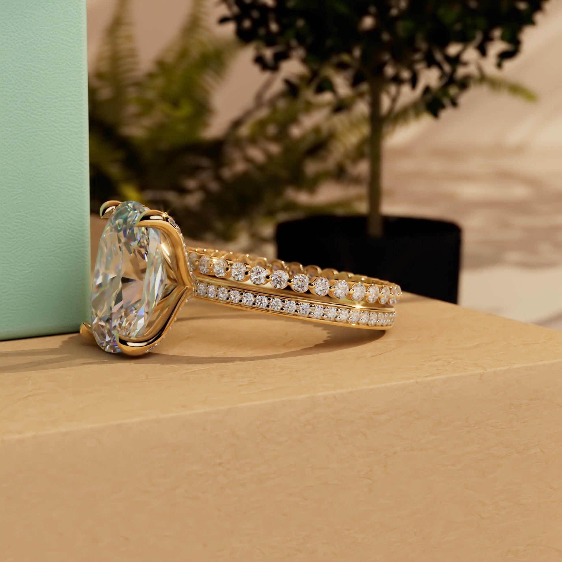 Elongated Cushion Cut Pave Basket Moissanite Engagement Ring, Wedding Bridal Set, Anniversary gift for wife, Ring for women