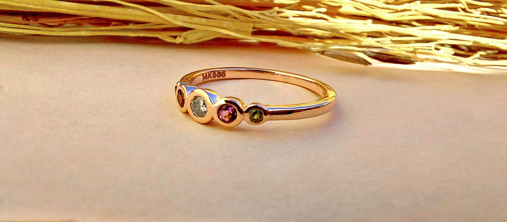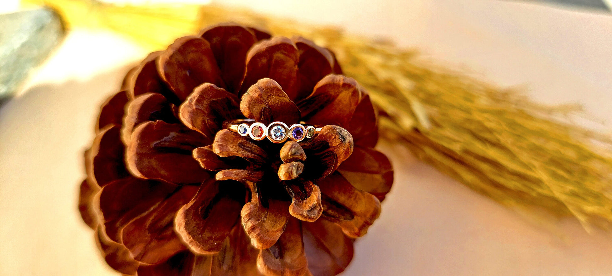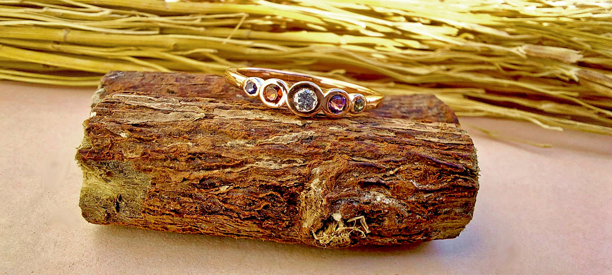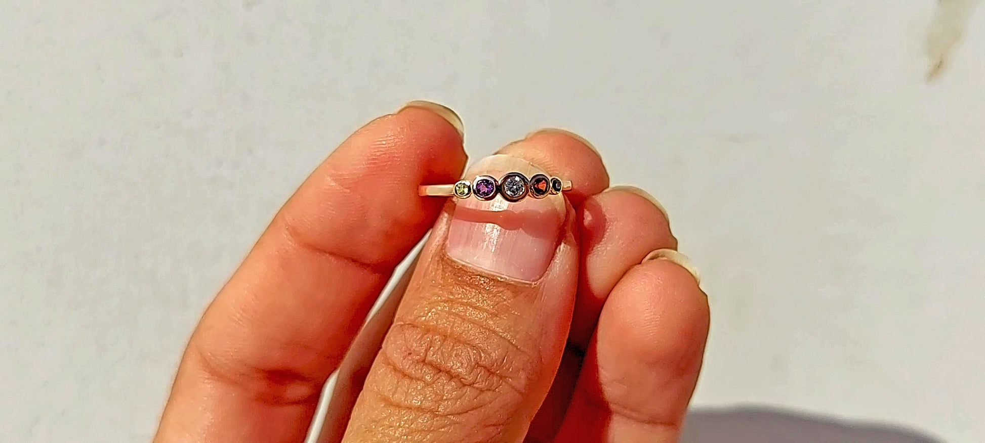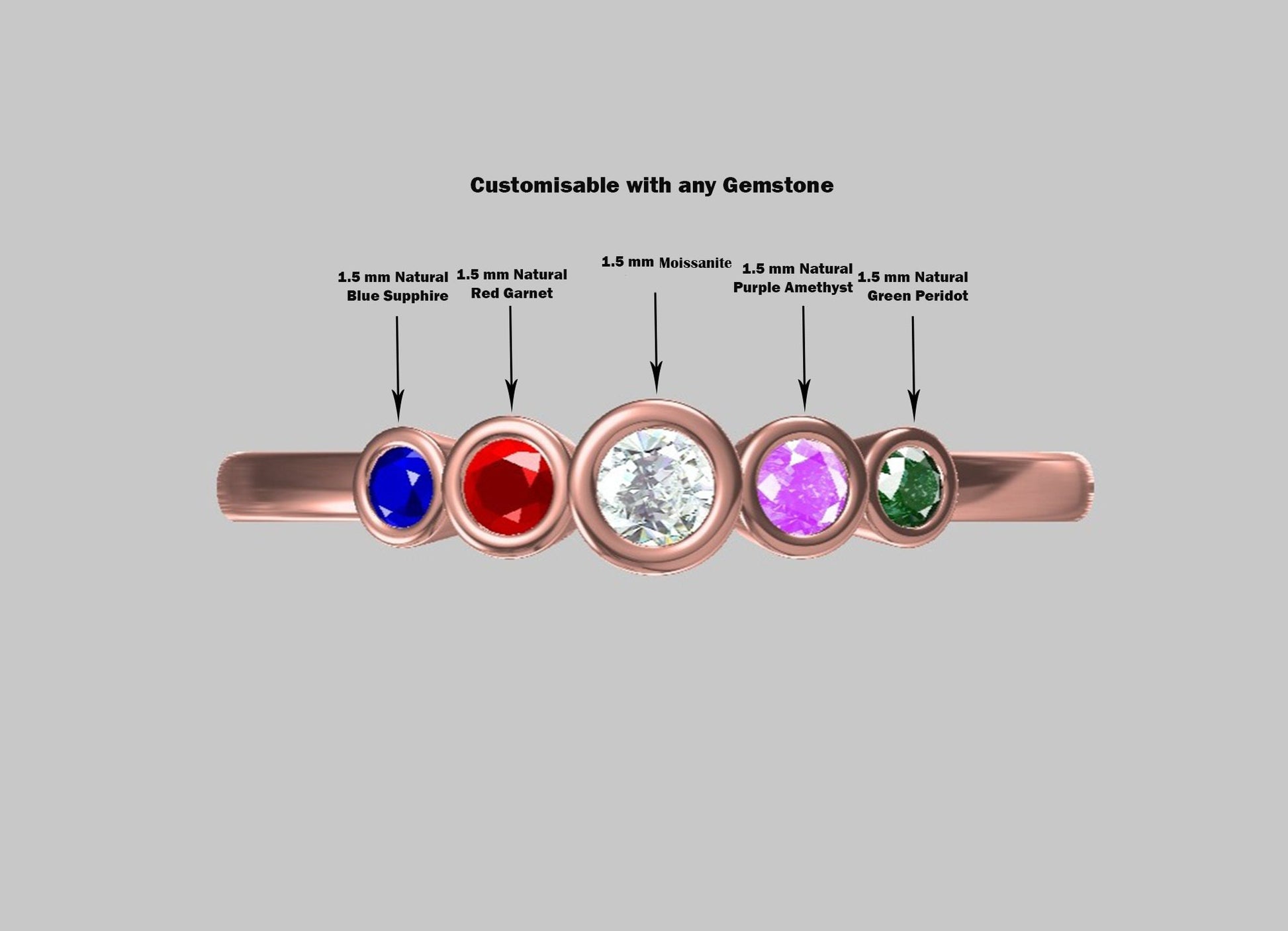 Got questions or concerns? Just send us a message — we're here to help!Five gemstone band with center moissanite stone, Promise or Wedding ring alternative, 5 stone Anniversary Band, Minimalist Stackable band