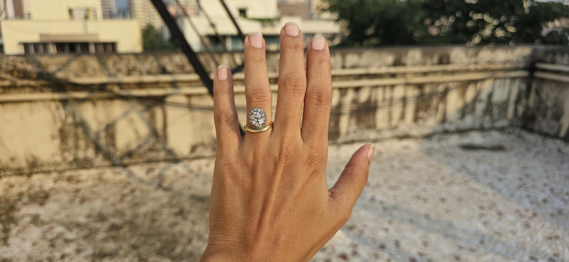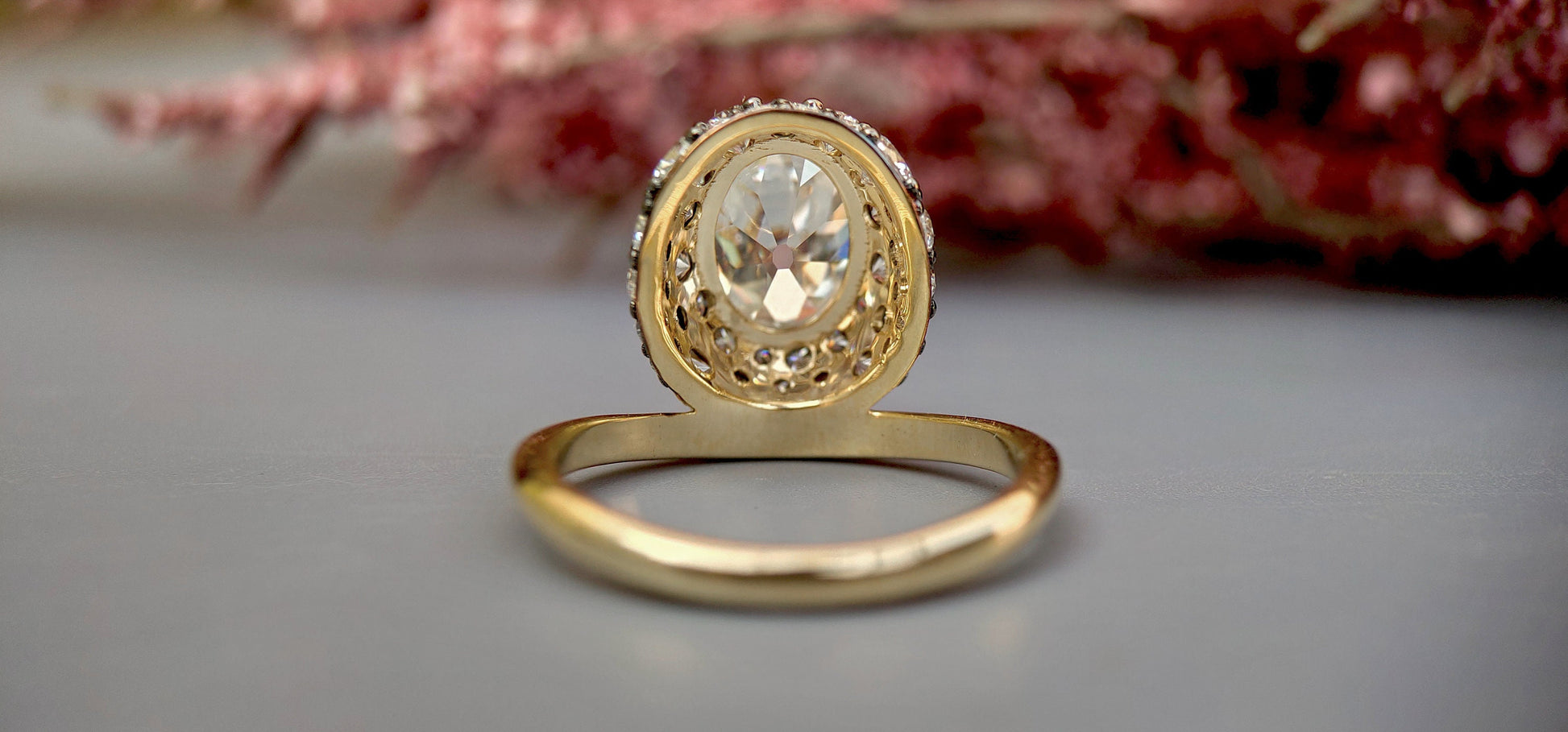 Floating Old mine cut Oval Halo set Georgian Moissanite Solitaire Engagement ring, Ring for her, right hand ring, Vintage Pave basket ring