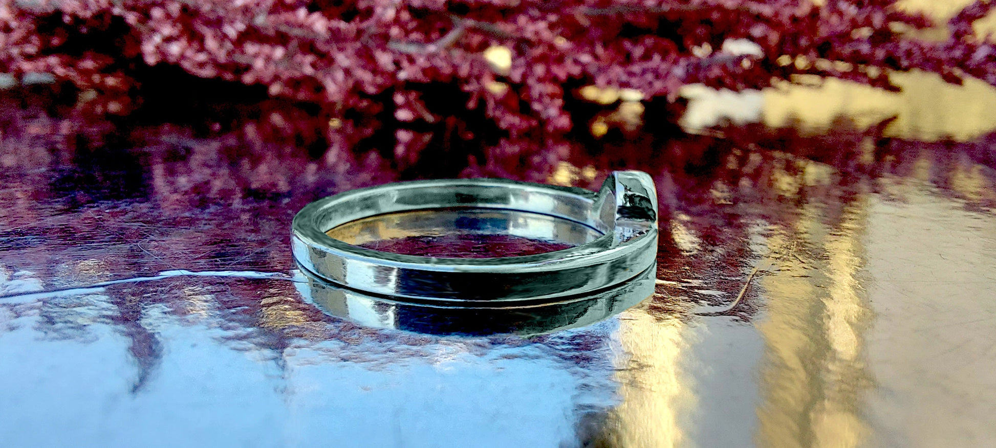 Bandwidth: The rectangular shank of this ring tapers down from the setting and