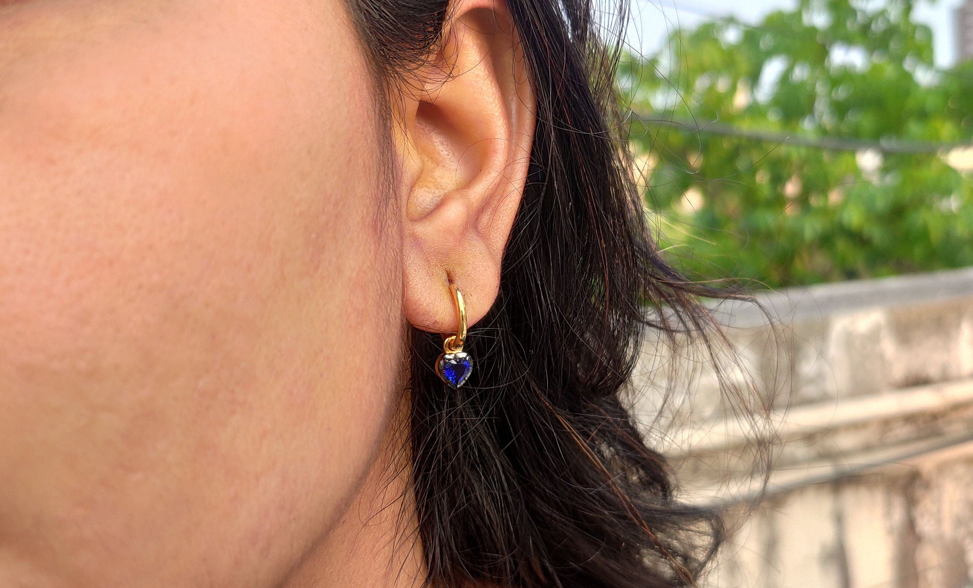 Got questions or concerns? Just send us a message — we're here to help!Heart Shaped Blue sapphire button back Georgian cut down removable Gypset, Lab sapphire Hoops, statement earring, blackened gold earrings.