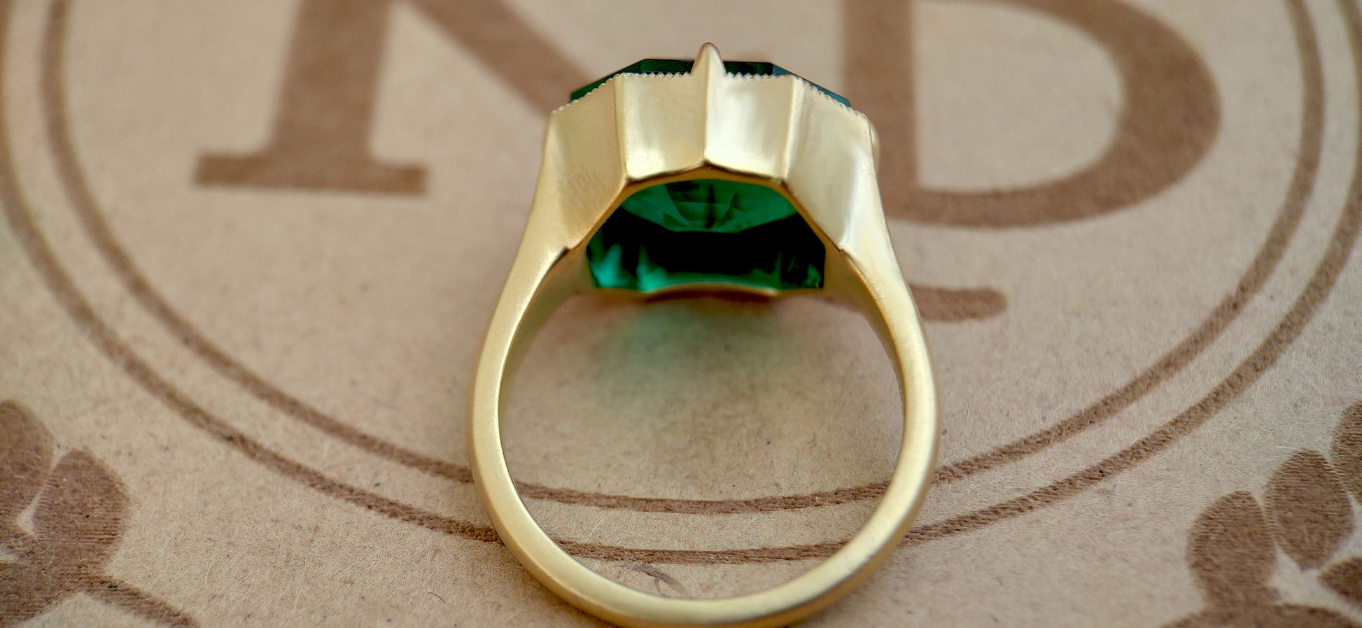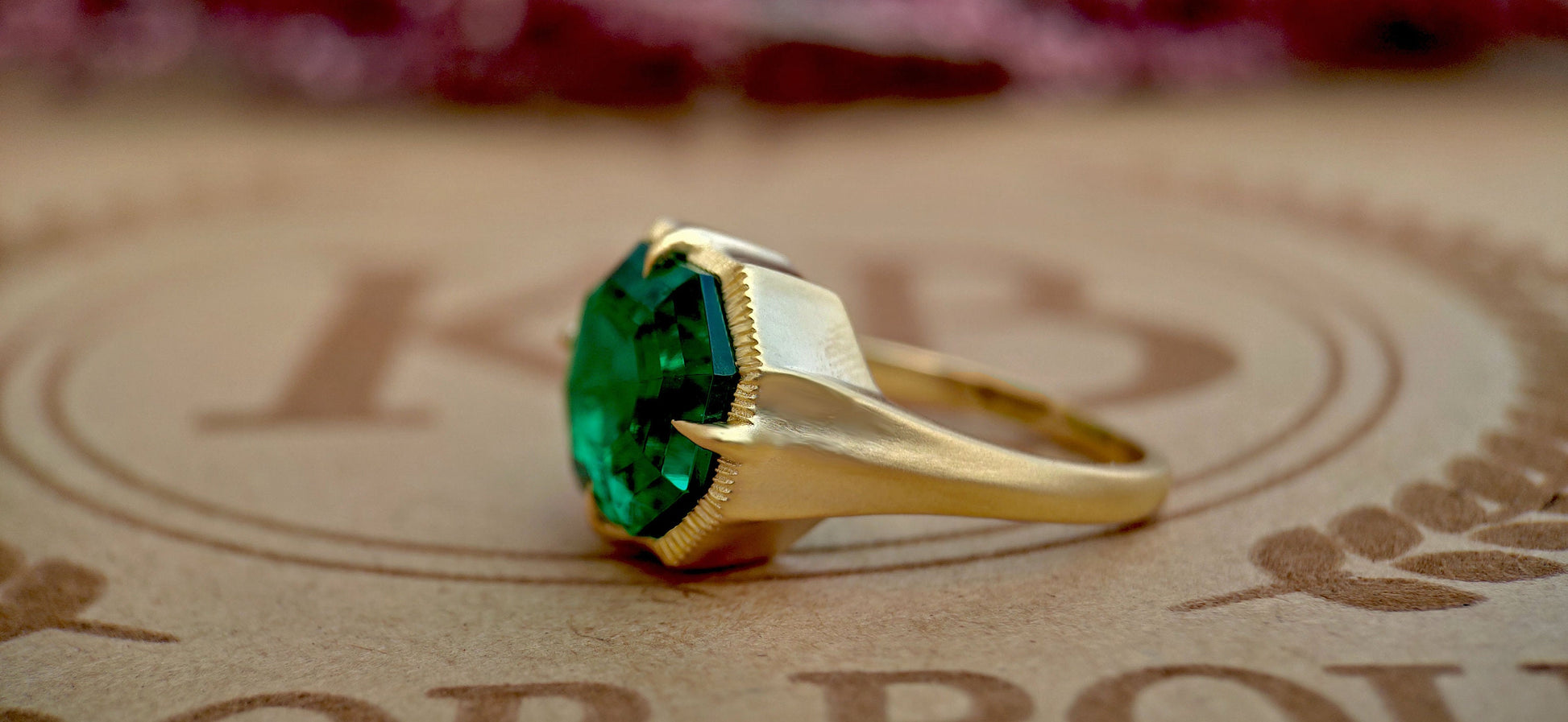 Got questions or concerns? Just send us a message — we're here to help!Lab Grown Emerald Georgian cut down Compass prongs set Knife edge Signet Solitaire Engagement ring, Ring for her, Ring for Women.