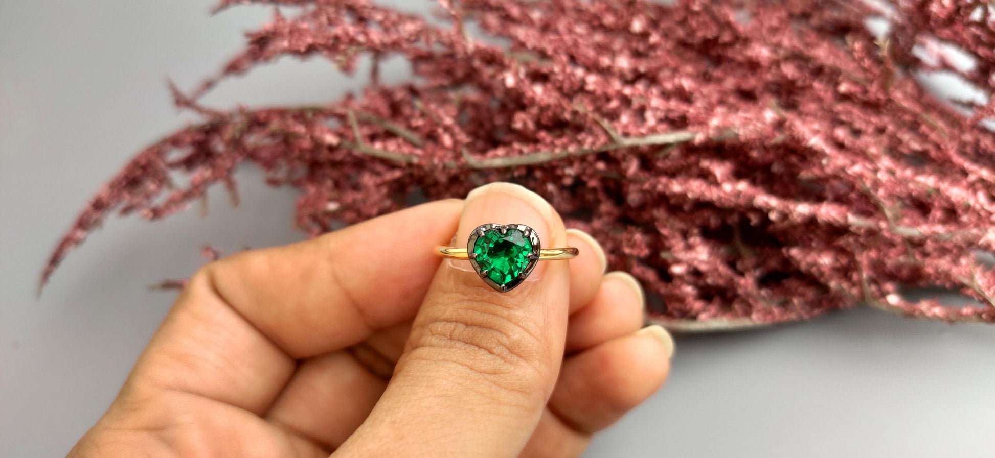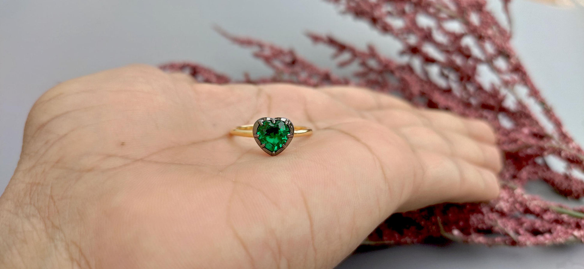 Lab Emerald Heart Cut Georgian cut down button back solitaire engagement ring, ring for her, ring for women, blackened gold stackable ring.