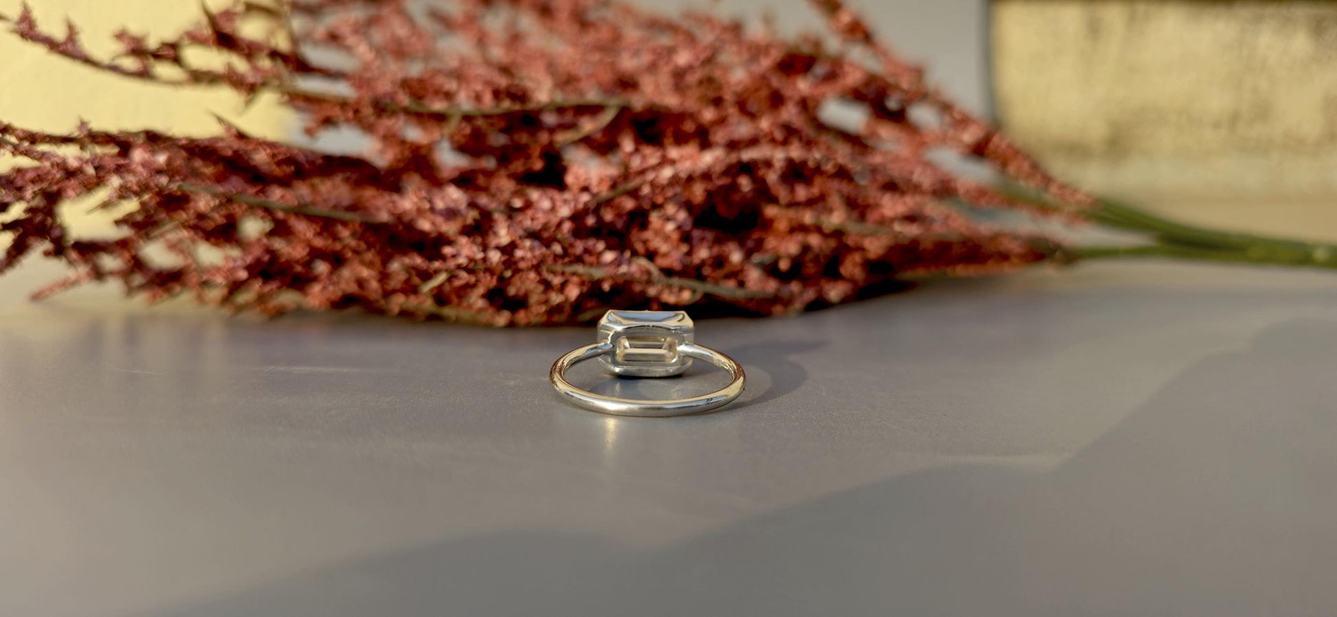 Lab grown East West set Elongated Emerald Cut Georgian cut down button back solitaire engagement ring, ring for her, ring for women