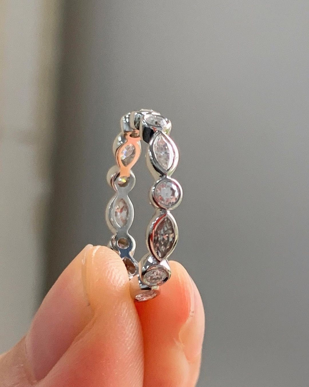 Got questions or concerns? Just send us a message — we're here to help!Marquise and Round Bezel Set Moissanite wedding band, stackable minimalist ring, Full Eternity Ring, wedding gift, anniversary gift for wife