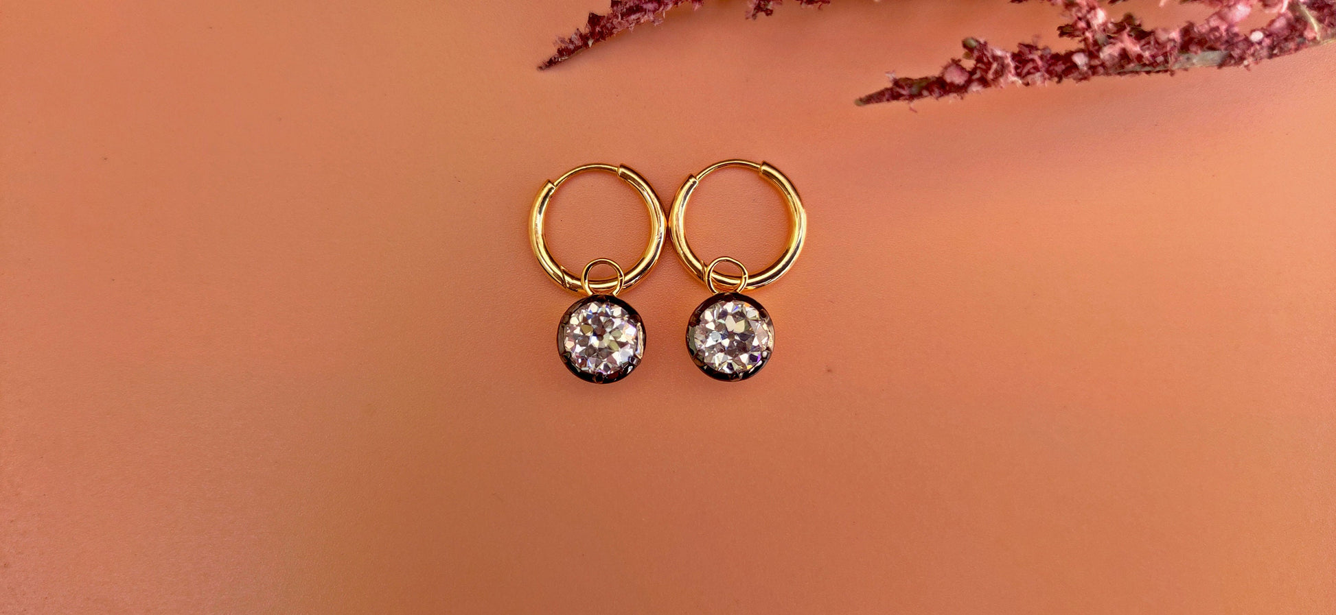 Old European Cut OEC Round Moissanite button back Georgian cut down Gypset, statement earring, blackened gold earrings.