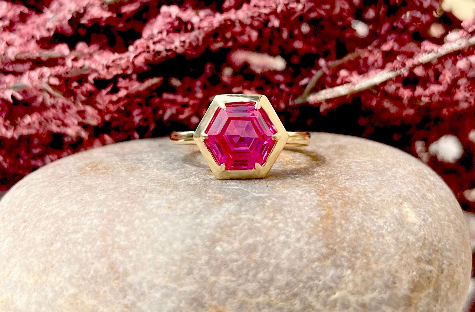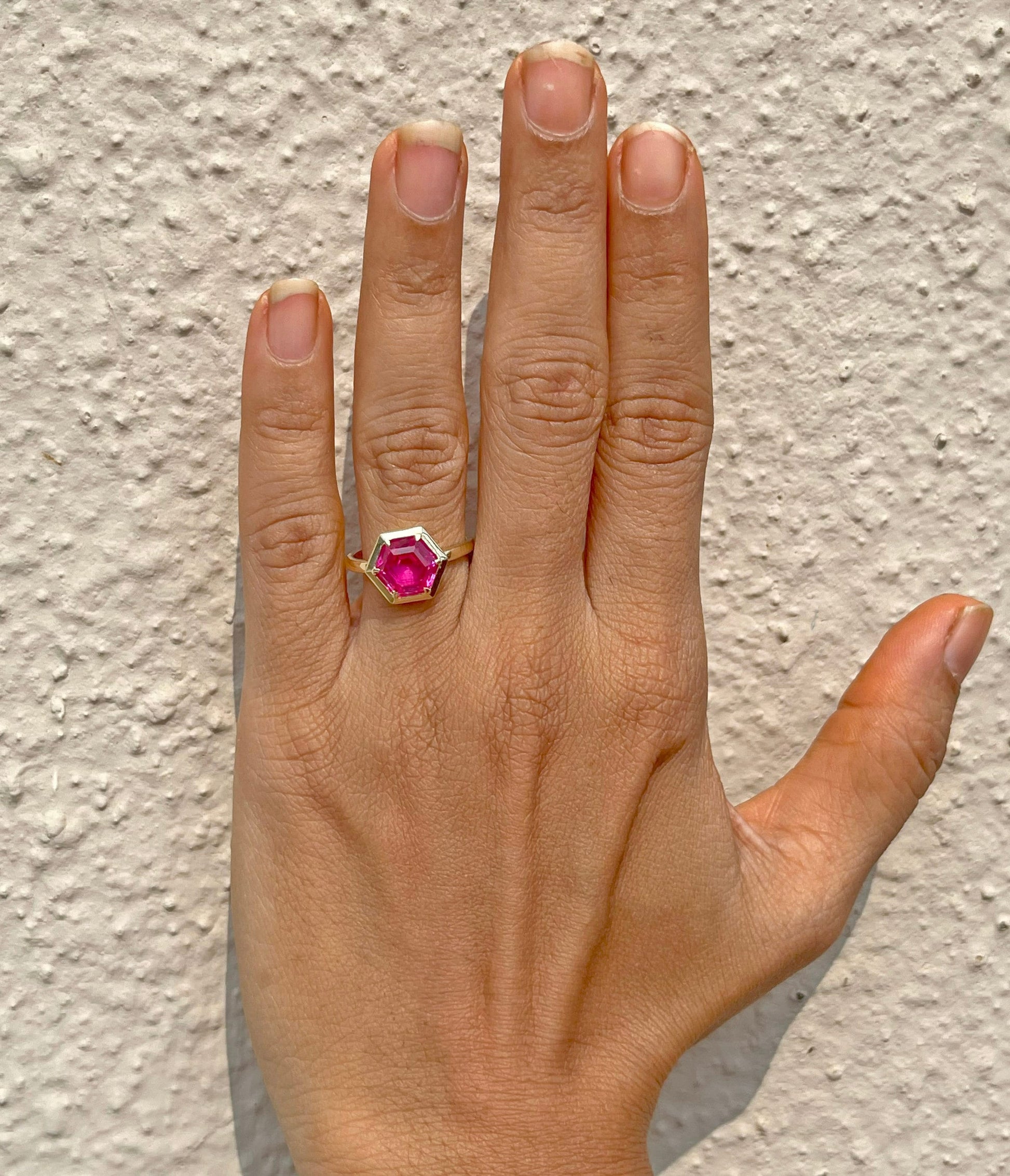 Got questions or concerns? Just send us a message — we're here to help!Pink Sapphire Hexagon shaped Bezel set Georgian cut down set Solitaire Engagement ring Promise proposal Ring for Modern Brides, ring for her