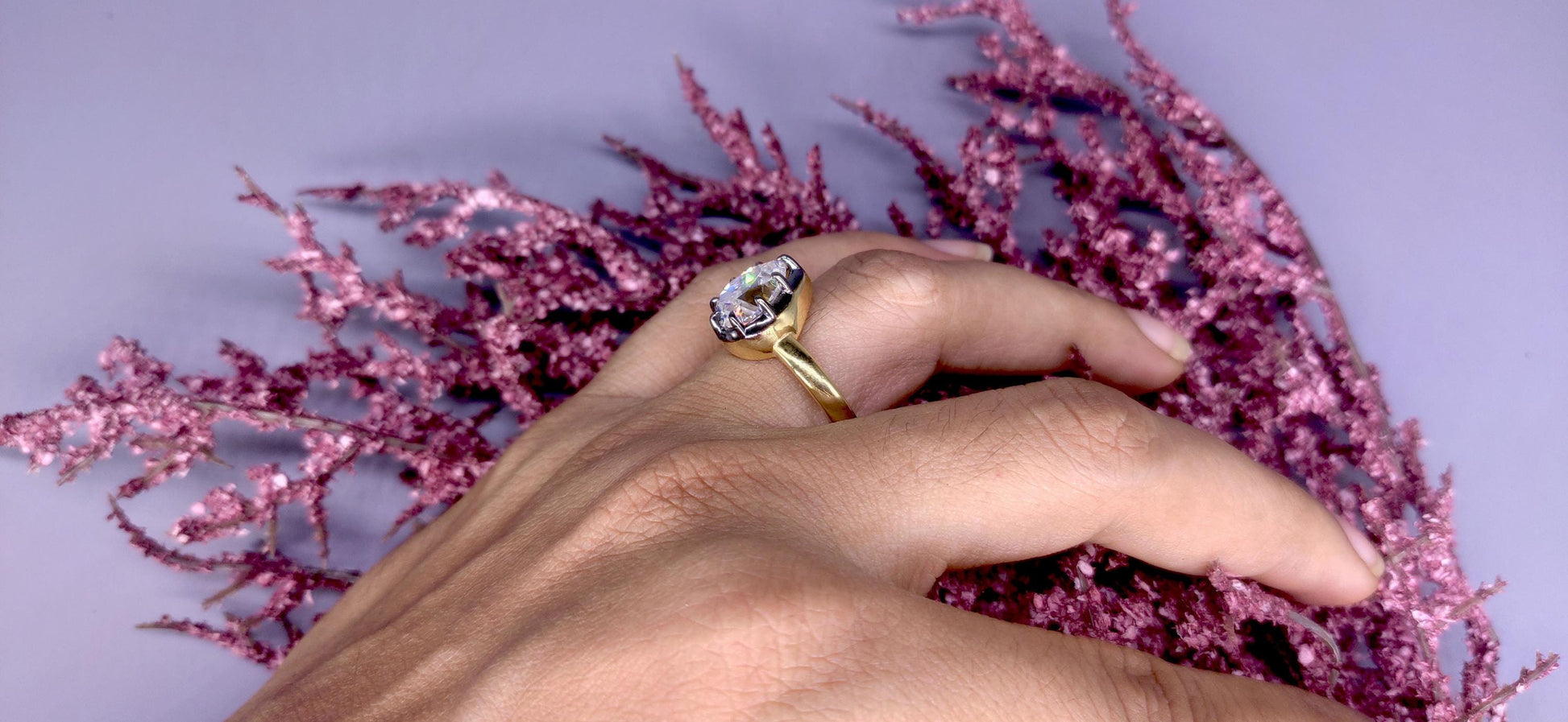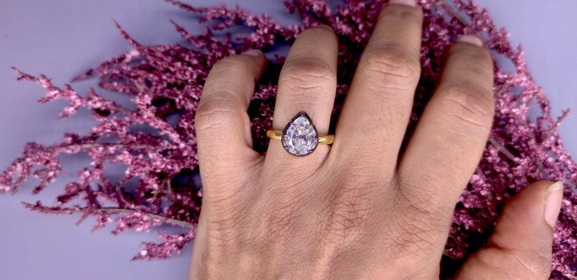 Ready to ship Old Mine Cut Pear Moissanite Collet set Ring US 6 size, =Georgian cut down set in silver with gold polish and blackened gold