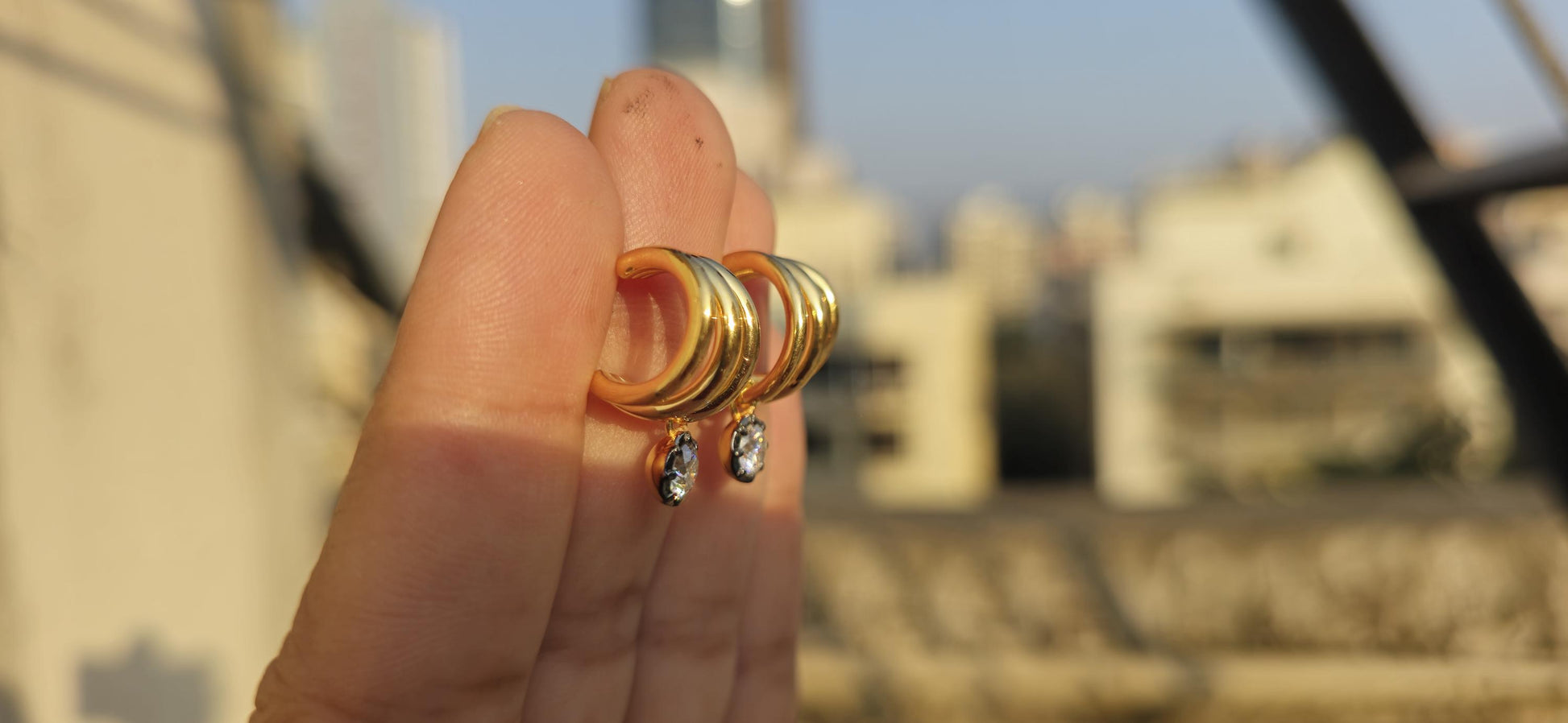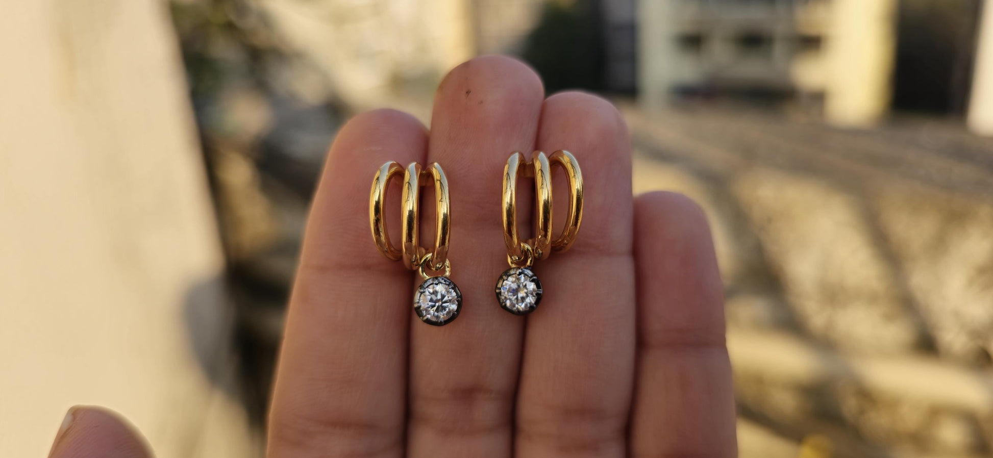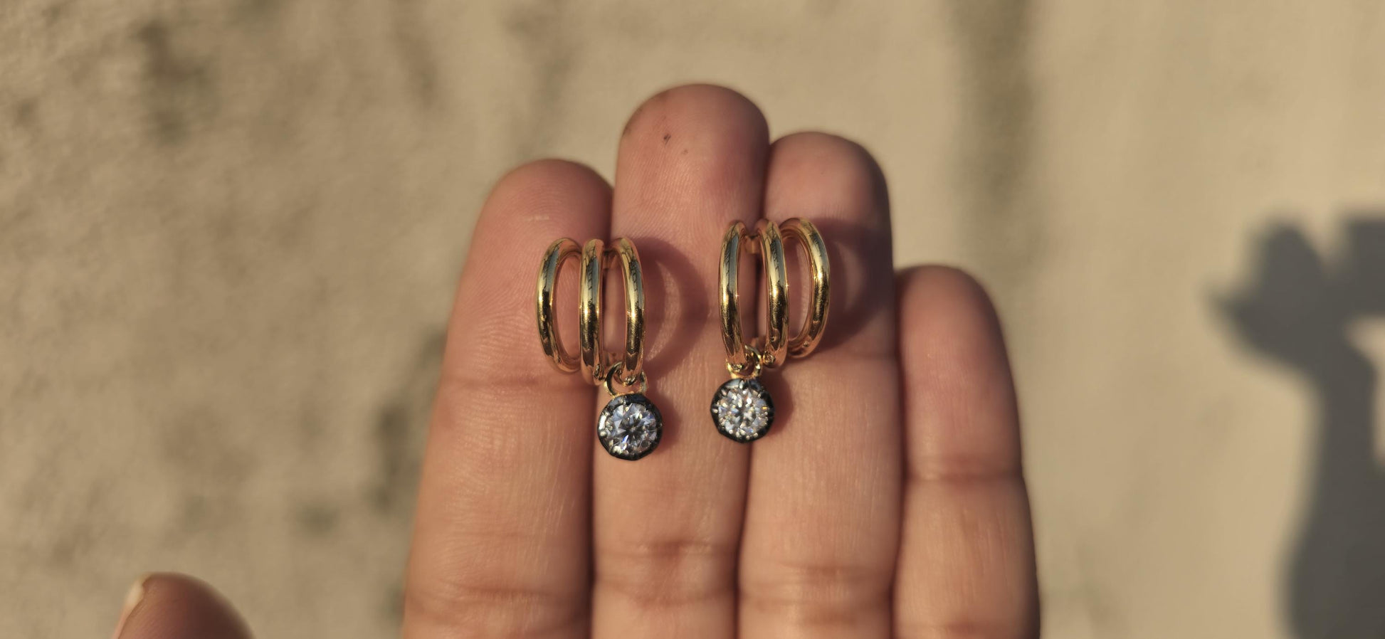 Round Moissanite button back Georgian cut down tripset hoops ,2 in 1 statement earring, blackened gold earrings.