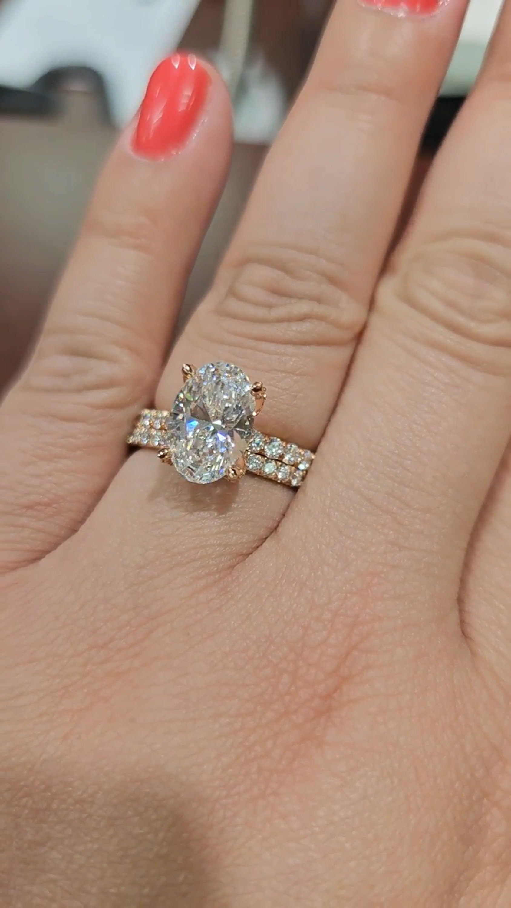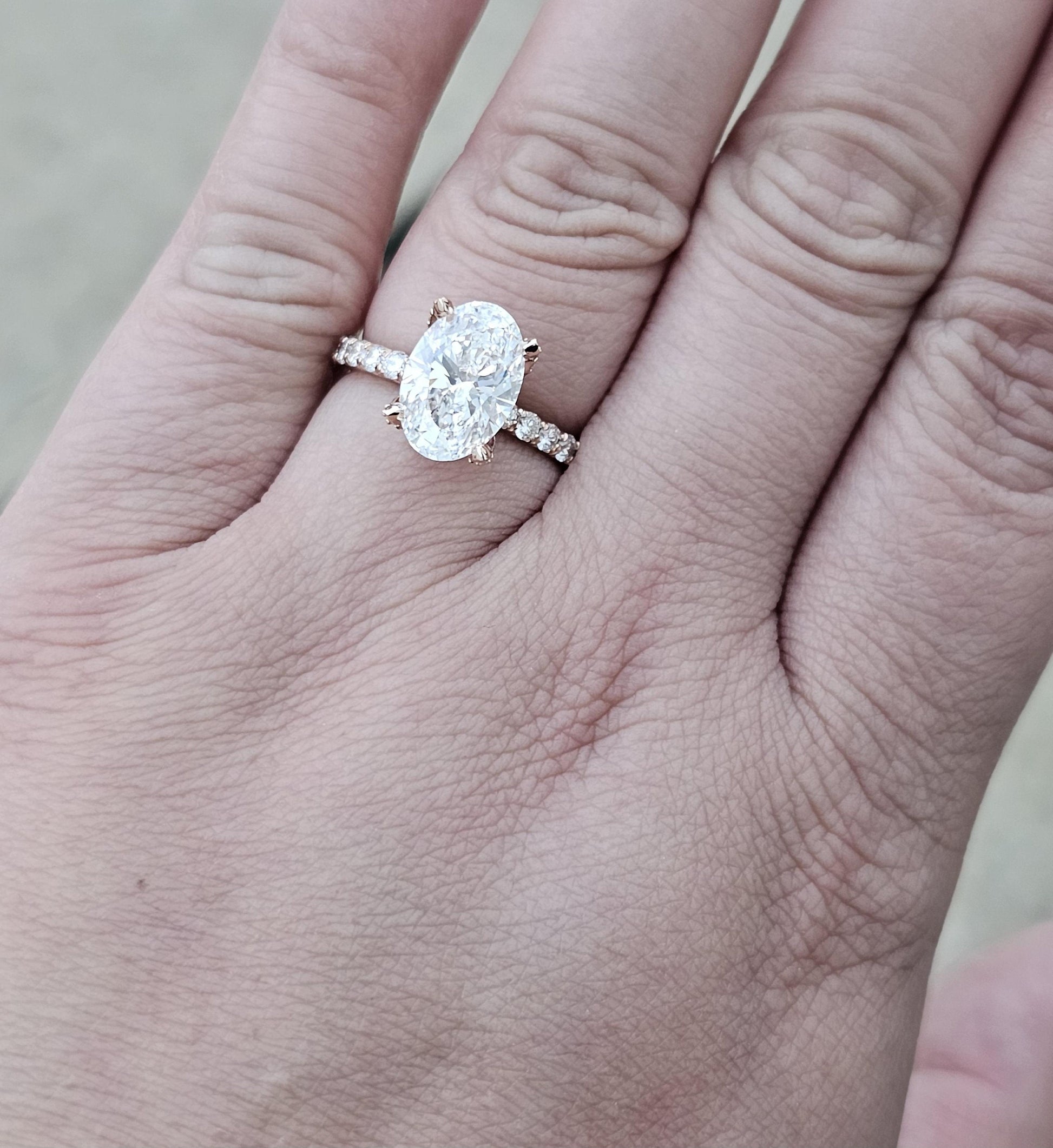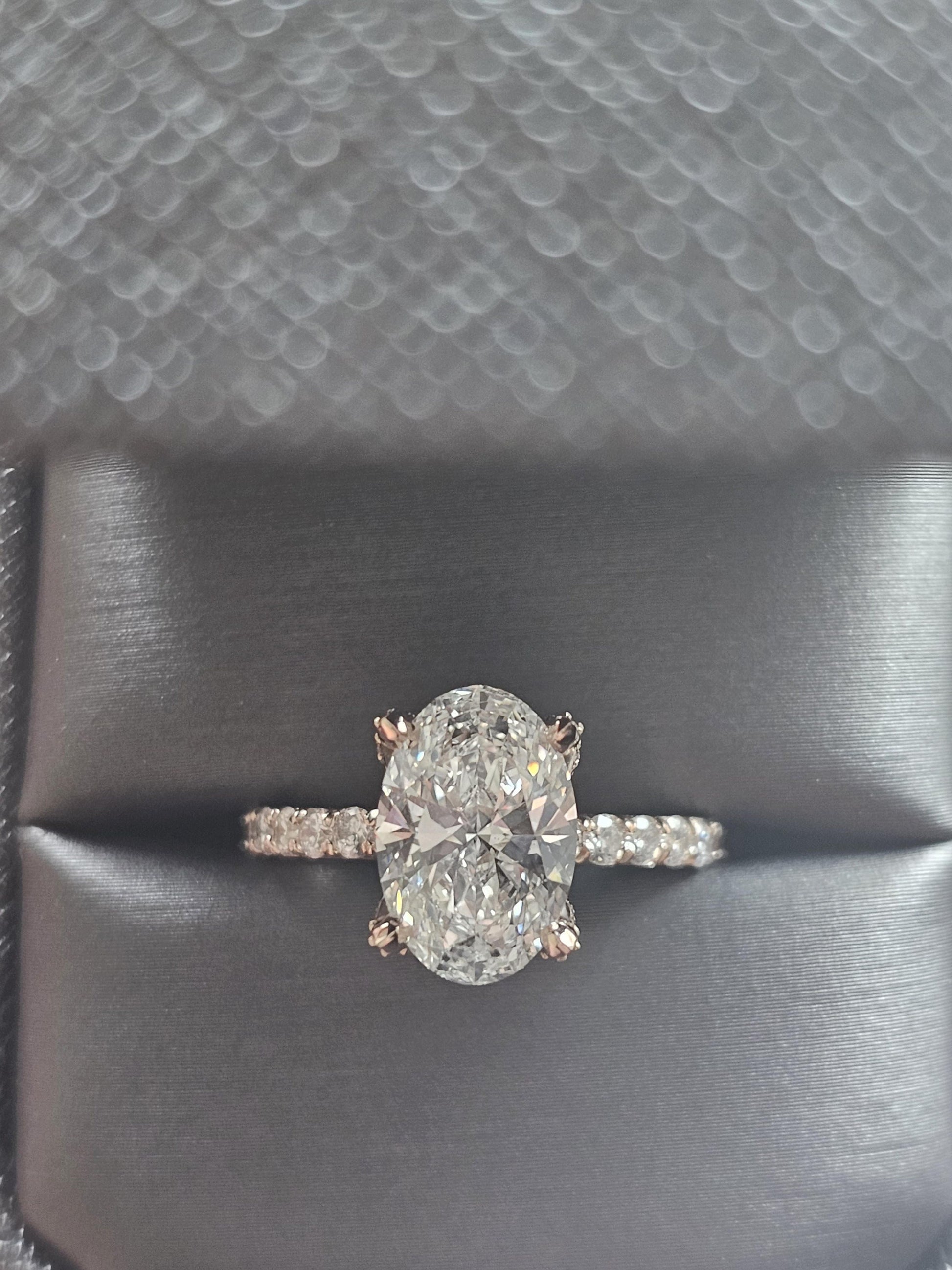 Got questions or concerns? Just send us a message — we're here to help!Tulip Lotus Prong Oval Moissanite Solitaire Engagement Ring with Pave basket and French set Pave band, petal prong ring, tulip prong ring.