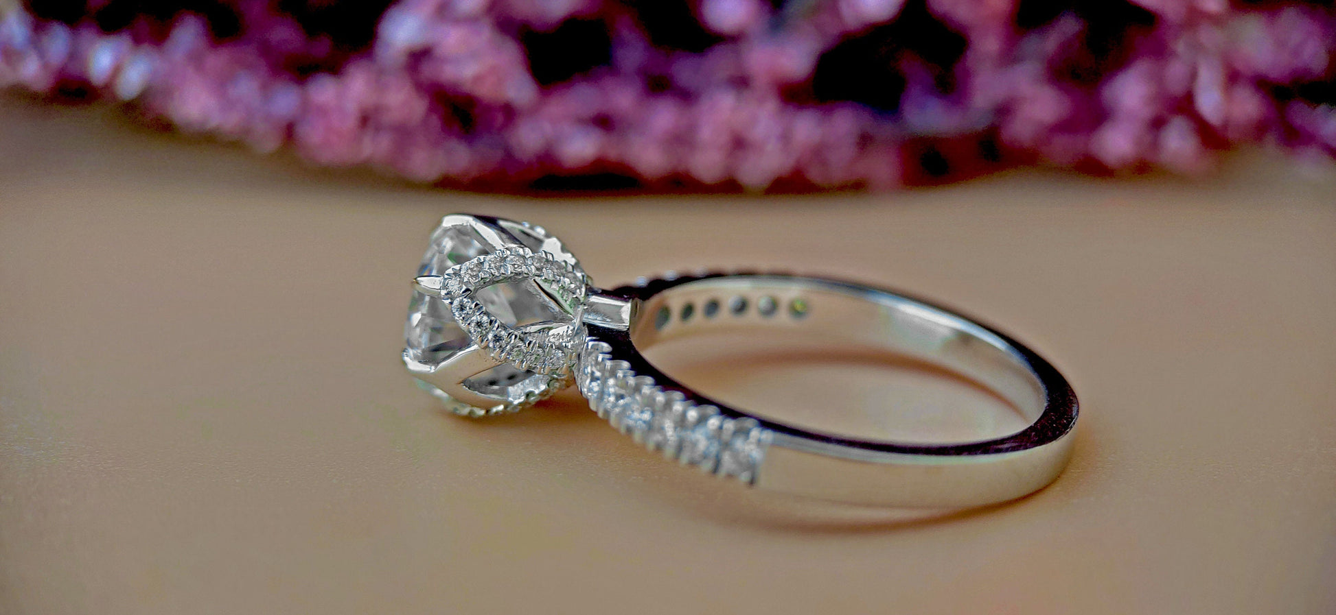 Got questions or concerns? Just send us a message — we're here to help!Tulip Pave basket Round with French Pave Band Moissanite Solitaire Engagement Ring, Lotus Prong with flower basket Promise\proposal Ring.