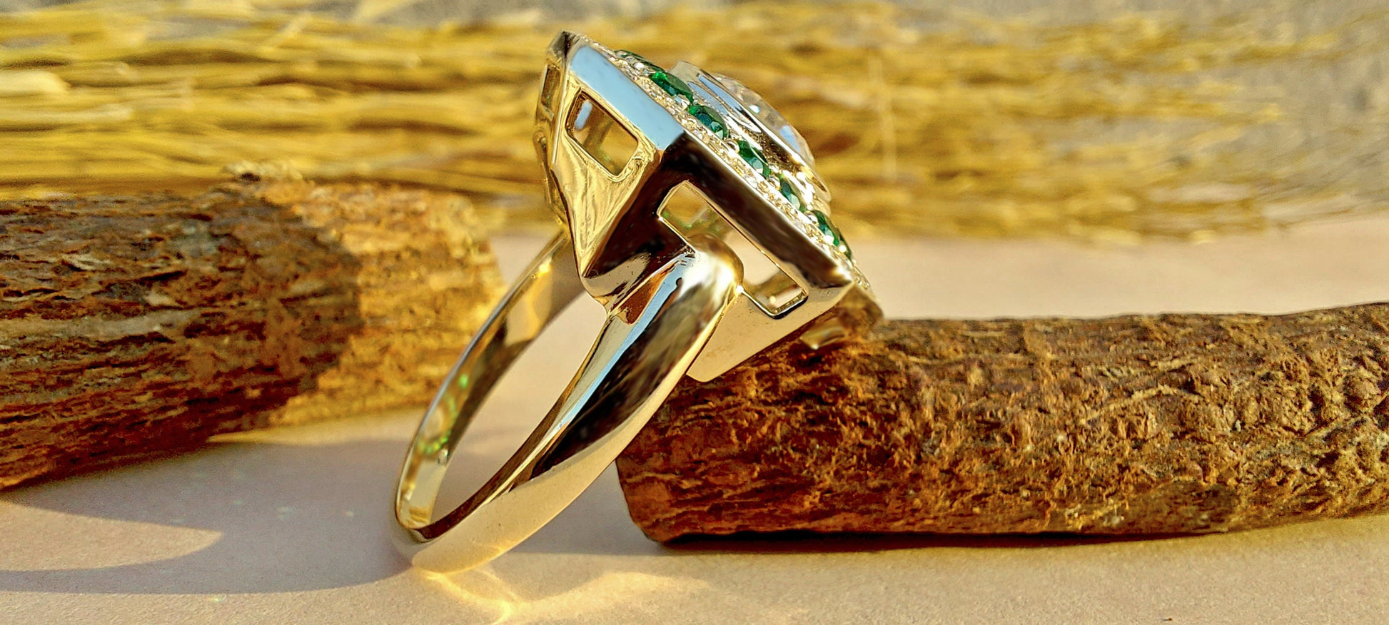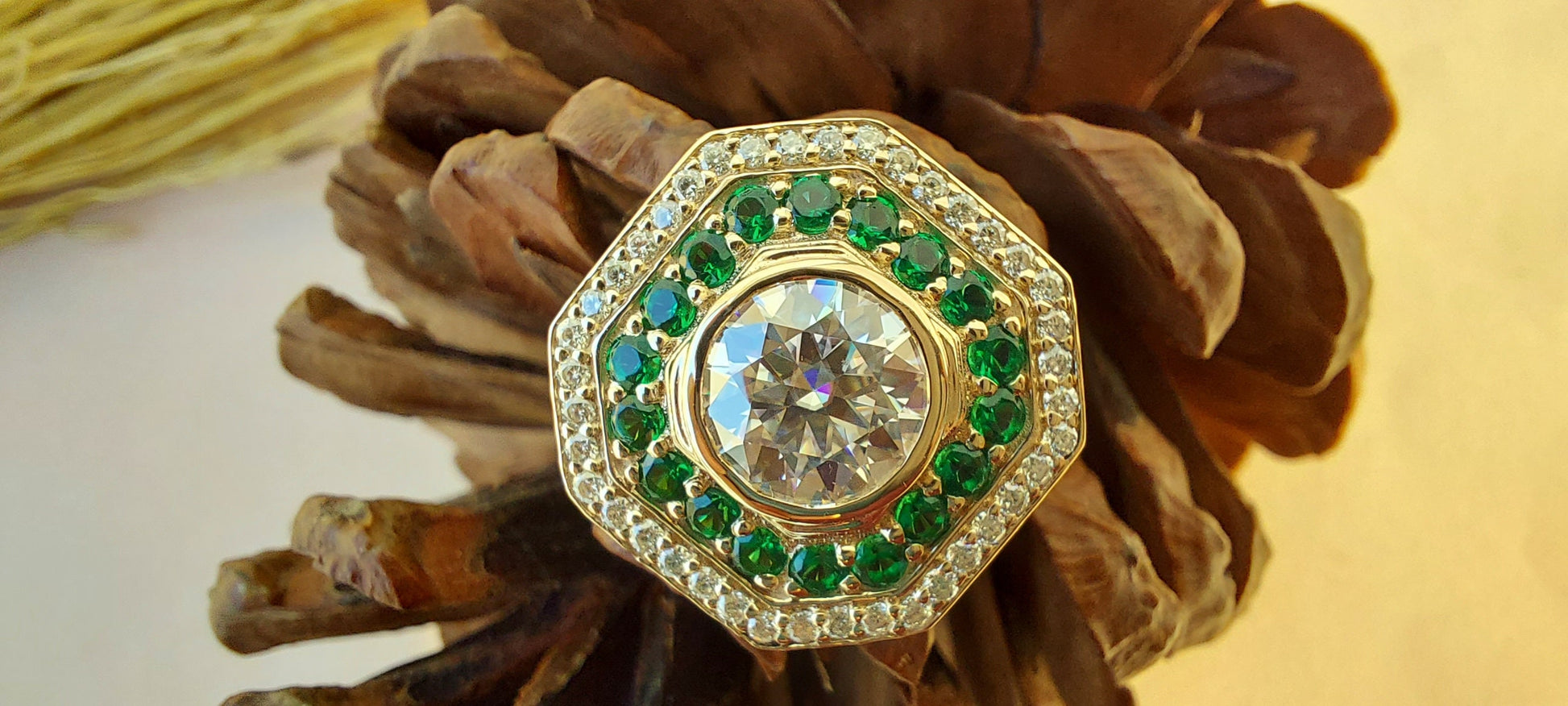 green moissanite ring, solitaire ring, and some festival jewelry like Easter gifts,